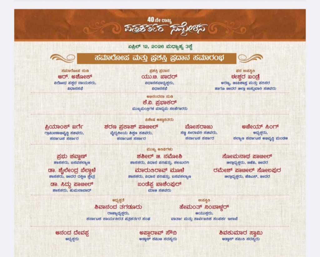 ಏ.12ರಂದು ಬೆಳಿಗ್ಗೆ 9.45ಕ್ಕೆ ಸಂಘದ ರಾಜ್ಯಾಧ್ಯಕ್ಷ ಶಿವಾನಂದ ತಗಡೂರು ಅಧ್ಯಕ್ಷತೆಯಲ್ಲಿ ಪ್ರತಿನಿಧಿಗಳ ಸಮಾವೇಶ ಮತ್ತು ಸರ್ವ ಸದಸ್ಯರ ಸಭೆ ನಡೆಯಲಿದೆ. ಬೆಳಿಗ್ಗೆ 11.30ಕ್ಕೆ ಮಾಹಿತಿ ಹಕ್ಕು ಮತ್ತು ಪತ್ರಕರ್ತರು ಕುರಿತು 3ನೇ ವಿಚಾರಗೋಷ್ಠಿ ನಡೆಯಲಿದೆ. ಕರ್ನಾಟಕ ಮಾಹಿತಿ ಹಕ್ಕು ಆಯೋಗದ ಆಯುಕ್ತ ರುದ್ರಣ್ಣ ಹರ್ತಿಕೋಟೆ ಉದ್ಘಾಟಿಸುವರು. ಮತ್ತೋರ್ವ ಆಯುಕ್ತ ಬದ್ರುದ್ದೀನ್ ವಿಷಯ ಪ್ರಸ್ತಾವನೆ ಮಾಡುವರು. ಆಯೋಗದ ಕಲಬುರಗಿ ವಿಭಾಗದ ಆಯುಕ್ತ ಬಿ.ವೆಂಕಟಸಿಂಗ್ ಅವರು ಅಧ್ಯಕ್ಷತೆ ವಹಿಸುವರು. ಮಧ್ಯಾಹ್ನ 12ಕ್ಕೆ ಆರ್ಟಿಫಿಷಿಯಲ್ ಇಂಟಿಲಿಜೆನ್ಸ್, ಡಿಜಟಲೀಕರಣ ಪ್ರಭಾವ ಕುರಿತು ಗೋಷ್ಠಿ ನಡೆಯಲಿದೆ. ಪತ್ರಕರ್ತ ರವಿ ಹೆಗಡೆ ಉದ್ಘಾಟಿಸುವರು ಎಂದರು.ಮಧ್ಯಾಹ್ನ 3ಕ್ಕೆ ಸಮಾರೋಪ ಸಮಾರಂಭ ಮತ್ತು ಪ್ರಶಸ್ತಿ ಪ್ರದಾನ ಸಮಾರಂಭ ನಡೆಯಲಿದೆ. ಸ್ಪೀಕರ್ ಯು.ಟಿ. ಖಾದರ್ ಅವರು ಪ್ರಶಸ್ತಿ ಪ್ರದಾನ ಮಾಡಲಿದ್ದಾರೆ ಎಂದು ತಿಳಿಸಿದರು.ಸುದ್ದಿಗೋಷ್ಠಿಯಲ್ಲಿ ಸಂಘದ ಜಿಲ್ಲಾ ಪ್ರಧಾನ ಕಾರ್ಯದರ್ಶಿ ಸಿದ್ದಪ್ಪ ಲಿಂಗೇರಿ ಇದ್ದರು.