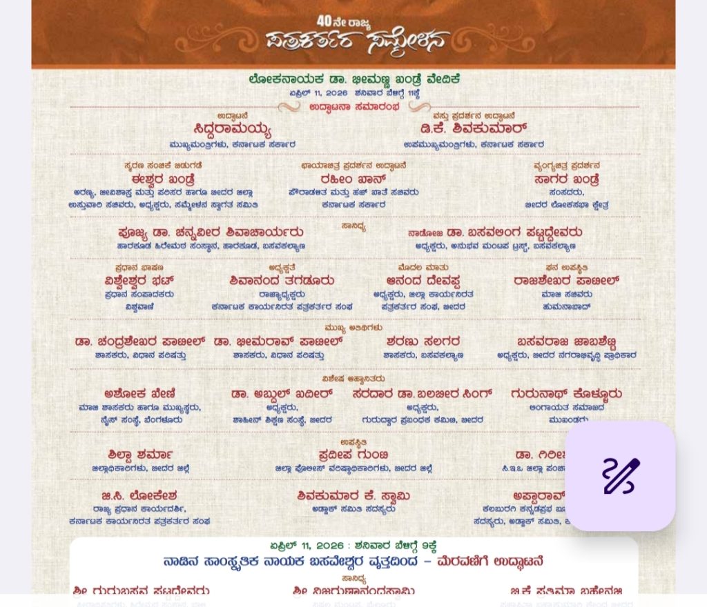 ಬಸವಕಲ್ಯಾಣದ ಹಾರಕೂಡ ಹಿರೇಮಠದ ಶ್ರೀ ಡಾ.ಚನ್ನವೀರ ಶಿವಾಚಾರ್ಯರು, ಬಸವ ಕಲ್ಯಾಣ ಅನುಭವ ಮಂಟಪದ ಅಧ್ಯಕ್ಷ ಡಾ.ಬಸವಲಿಂಗ ಪಟ್ಟದ್ದೇವರು ಸಾನ್ನಿಧ್ಯ ವಹಿಸುವರು. ಪತ್ರಕರ್ತ ವಿಶ್ವೇಶ್ವರ ಭಟ್ ಪ್ರಧಾನ ಭಾಷಣ ಮಾಡುವರು. ಸಂಘದ ರಾಜ್ಯಾಧ್ಯಕ್ಷರಾದ ಶಿವಾನಂದ ತಗಡೂರು ಅಧ್ಯಕ್ಷತೆ ವಹಿಸುವರು ಎಂದು ತಿಳಿಸಿದರು.ಅದಕ್ಕೂ ಮುನ್ನ ಬಸವೇಶ್ವರ ವೃತ್ತದಿಂದ ವೇದಿಕೆವರೆಗೂ ಕಲಾ ತಂಡಗಳೊಂದಿಗೆ ಸಮ್ಮೇಳನದ ಮೆರವಣಿಗೆ ನಡೆಸಲಾಗುವುದು ಎಂದು ವಿವರಿಸಿದರು.