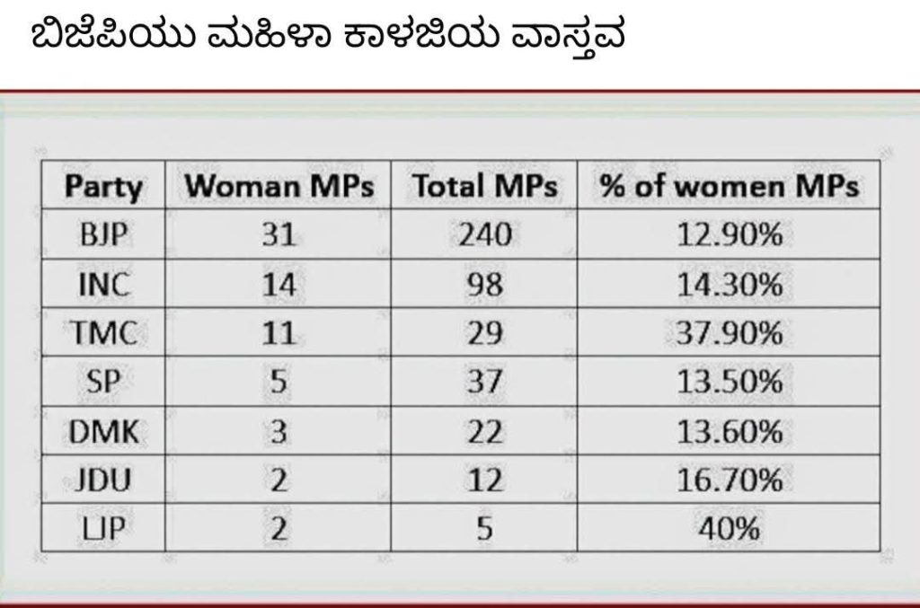 ನೋಡಿ ಹೇಗಿದೆ ಎಂದರೆ ದೇಶದಲ್ಲಿ ಮಹಿಳಾ ವಿರೋಧಿ ಕಾಂಗ್ರೆಸ್ ಪಕ್ಷ ಎಂದು ಮಾಧ್ಯಮಗಳಲ್ಲಿ ಖುದ್ದು ಪ್ರಧಾನಿಯವರೇ ದೇಶವನ್ನು ಉದ್ದೇಶಿಸಿ ರಾಜಕೀಯ ಭಾಷಣ ಮಾಡಿದ್ದಾರೆ.ಪದೇ ಪದೇ ಕಾಂಗ್ರೆಸ್ ಪಕ್ಷವನ್ನೇ ದೂಷಿಸುತ್ತಾರೆ.2014 ರಿಂದ 2024ರ ವರೆಗೆ ಎನ್ಡಿಎಗೆ ಸ್ಪಷ್ಟ ಬಹುಮತ ಸಿಕ್ಕಿದೆ. ಆಗ ಮಹಿಳಾ ಮೀಸಲಾತಿ ಜಾರಿಗೆ ತರಲಿಲ್ಲ. 2029 ರ ಚುನಾವಣೆ ಆದರಿಸಿ ಮಹಿಳಾ ಮೀಸಲಾತಿಗೆ ಕೈ ಹಾಕಿದೆ. 2014ರ ಹಿಂದೆ ಕಾಂಗ್ರೆಸ್ ಸರ್ಕಾರ ಮಹಿಳಾ ಮೀಸಲಾತಿ ಜಾರಿಗೆ ತರುವುದಕ್ಕೆ ಮುಂದಾದಾಗ ಇದೇ ಬಿಜೆಪಿಯವರು ವಿರೋಧಿಸಿದ್ದರು. ಈಗಲೂ ಕೂಡ ಬಿಜೆಪಿ ಸಂಸದರಲ್ಲಿ ಪುನರ್ ವಿಂಗಡನೆ ಬಗ್ಗೆ ವಿರೋಧವಿದೆ!