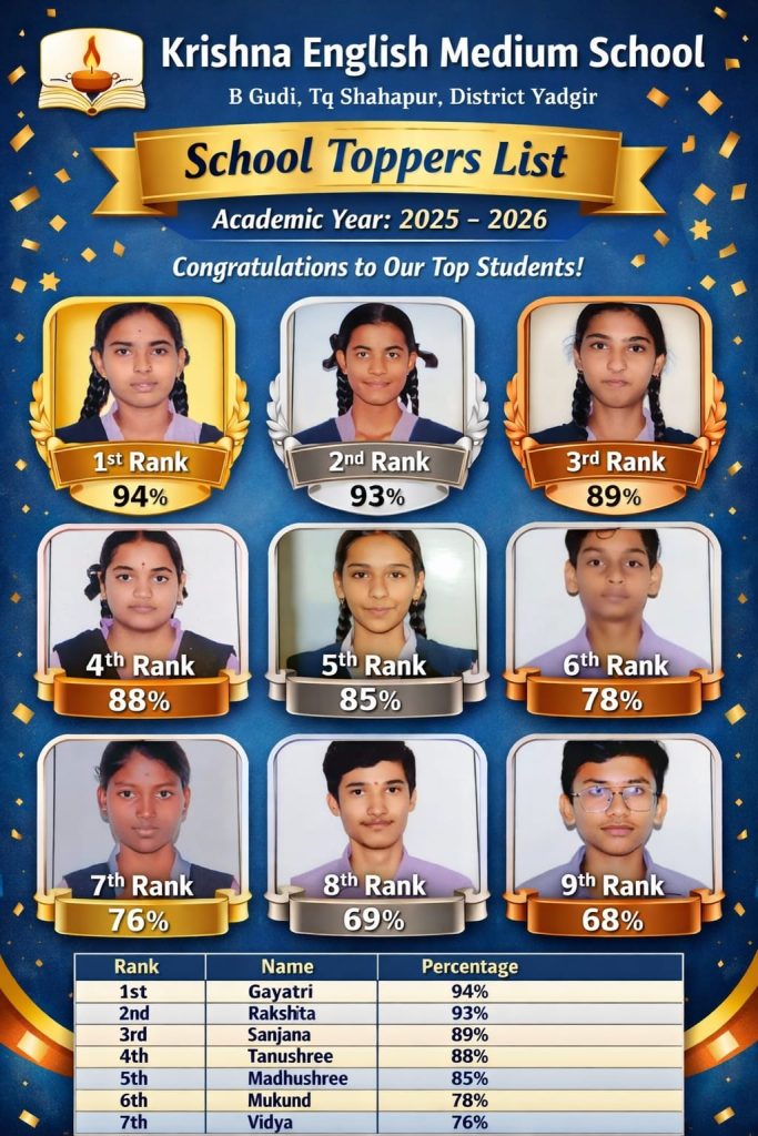 ತಾಲೂಕಿನ ಭೀಮರಾಯಗುಡಿಯಲ್ಲಿರುವ ಕೃಷ್ಣ ಆಂಗ್ಲ ಮಾಧ್ಯಮ ಶಾಲೆಗೆ 10ನೇ ತರಗತಿ ಫಲಿತಾಂಶದಲ್ಲಿ ಶೇ.100 ರಷ್ಟು ಫಲಿತಾಂಶ ದಾಖಲಾಗಿದ್ದು ಪರೀಕ್ಷೆಗೆ ಹಾಜರಾದ 13 ವಿದ್ಯಾರ್ಥಿಗಳಲ್ಲಿ 05 ವಿದ್ಯಾರ್ಥಿಗಳು ಅತ್ಯುತ್ತಮ ದರ್ಜೆ, 04 ವಿದ್ಯಾರ್ಥಿಗಳು ಪ್ರಥಮ ದರ್ಜೆ,04 ವಿದ್ಯಾರ್ಥಿಗಳು ದ್ವಿತೀಯ ದರ್ಜೇಯಲ್ಲಿ ಉತ್ತೀರ್ಣರಾಗಿದ್ದು ಗಾಯತ್ರಿ ಪಾಟೀಲ್ ಶೇ. 95, ರಕ್ಷಿತಾ ಶೇ 94 ,ಸಂಜನಾ ಶೇ 89, ತನುಶ್ರೀ ಶೇ 88,ಮಧುಶ್ರೀ ಶೇ 85, ಮುಕುಂದ ಶೇ 78, ವಿದ್ಯಾ ಶೇ 76, ರಾಜು ಸುಗಂಧಿ ಶೇ 70, ಕಿರಣ ಶೇ 60 ರಷ್ಟು ಫಲಿತಾಂಶ ದಾಖಲಿಸಿದ್ದು ಸಂಸ್ಥೆಯ ಅಧ್ಯಕ್ಷ ಅರವಿಂದ ಬಿ ಮುಡುಬುಳ ಹಾಗೂ ಆಡಳಿತ ವರ್ಗ,ಮುಖ್ಯ ಗುರುಗಳಾದ ಭಾಗ್ಯಶ್ರೀ ಹಾಗೂ ಶಿಕ್ಷಕ ವೃಂದದವರು ವಿದ್ಯಾರ್ಥಿಗಳ ಸಾಧನೆಗೆ ಹರ್ಷ ವ್ಯಕ್ತಪಡಿಸಿದ್ದಾರೆ.